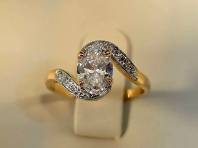 Très belle bague style ancien or 750 millièmes jaune, rose, blanc, diamant ovale de 1 carat EVS1 certifiée et diamants sur le corps