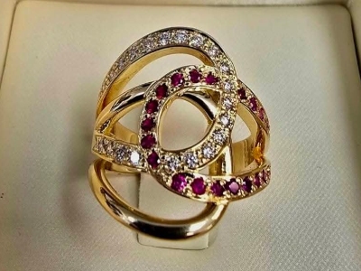 Bague or jaune 750 millièmes 9.71gr avec 21 diamants de 0.63 carat et 20 rubis taille brillant en dégradé de couleur
